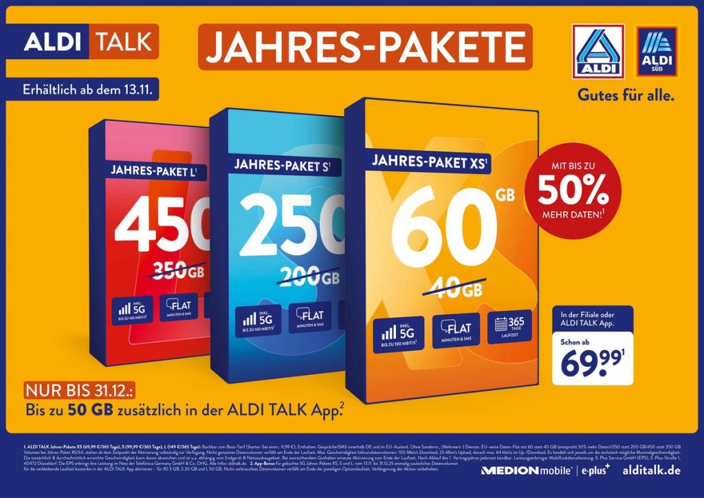 Ab dem 13. November bietet ALDI TALK mehr Datenvolumen in den Jahrespaketen. Der Discounter erhöht die Inklusiv-Gigabyte bei gleichbleibenden Preisen um bis zu 50 Prozent. Das kleinste Paket XS kommt mit 60 statt bisher 40 GB und kostet für 365 Tage immer noch 69,99 Euro. Mit dem S-Paket erhöht sich das Volumen von 200 auf 250 GB zum Preis von 99,99 Euro. Das größte Paket L bietet nun 450 statt 350 GB für 149 Euro.