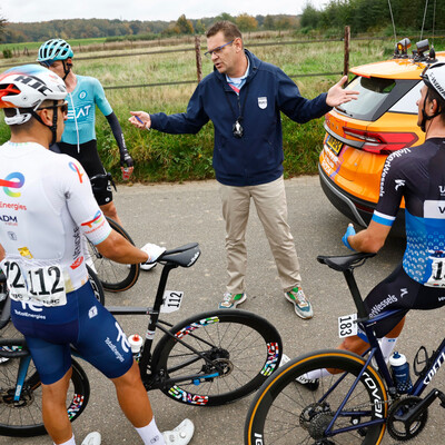 UCI-Kommissar Pim Kroon spricht mit den gestoppten Fahrern bei der Tour of Holland. | Foto: Cor Vos