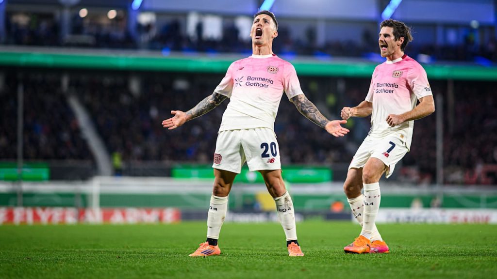 Alejandro Grimaldo (30) sorgte im 4:2 nV-Pokalspiel in Paderborn für das 1:0 für Leverkusen – natürlich per Freistoß. Der Spanier erzielte sein viertes Freistoßtor der laufenden Saison Bayer 04: Zwei in der Bundesliga, eines in der Champions League und jetzt dieses Traumtor im DFB-Pokal.