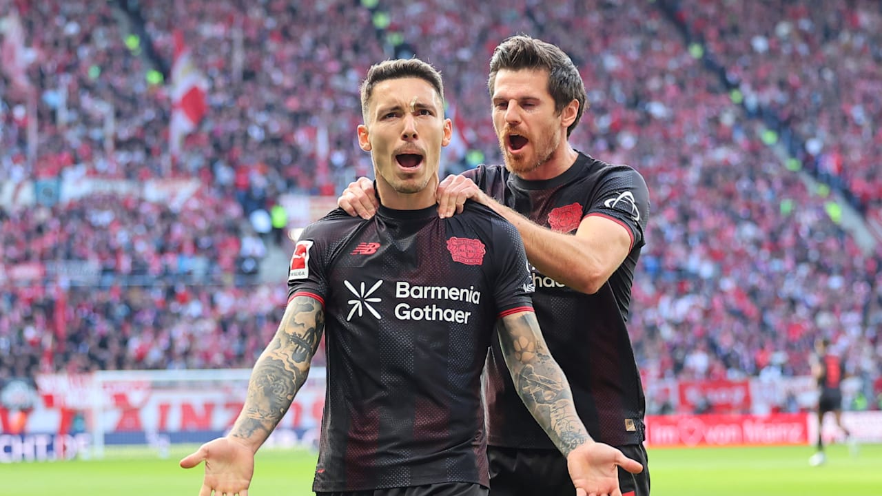 Jonas Hofmann (l.) jubelt mit Christian Kofane (24), dem Torschützen zum 2:0 für Leverkusen in Mainz