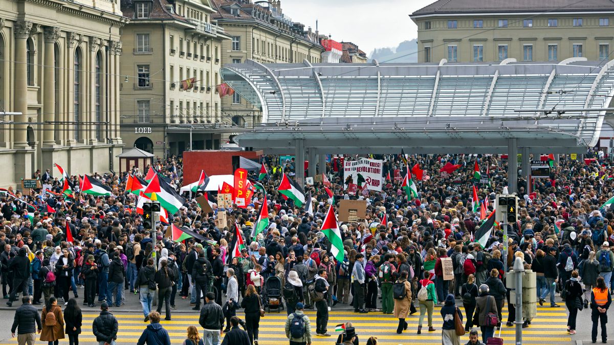 Die Demonstration, die unter dem Motto „Palästina-Nationaldemo – 2 Jahre Völkermord, 100 Jahre Widerstand“ stand, zog vom Bahnhofplatz durch das Regierungsviertel in die Berner Innenstadt.