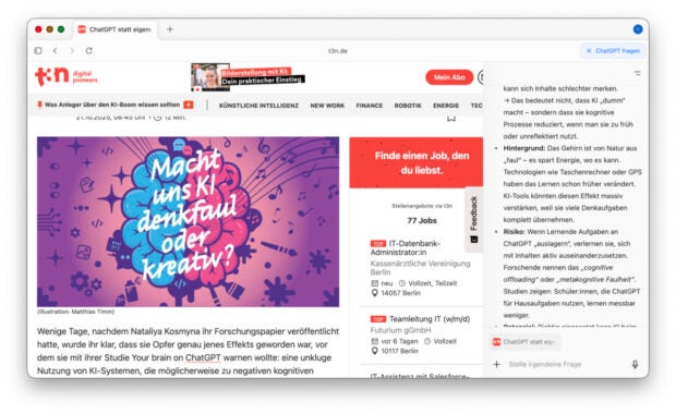 Oben rechts im Browserfenster befindet sich außerdem eine Schaltfläche mit der Aufschrift „Ask ChatGPT“. Ein Klick darauf öffnet eine Seitenleiste mit Chat-Oberfläche, über die Sie direkt Fragen zur geöffneten Website stellen können, um beispielsweise den Inhalt eines Artikels von der KI zusammenfassen zu lassen.