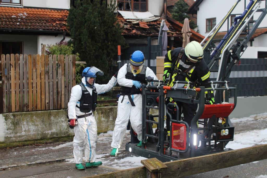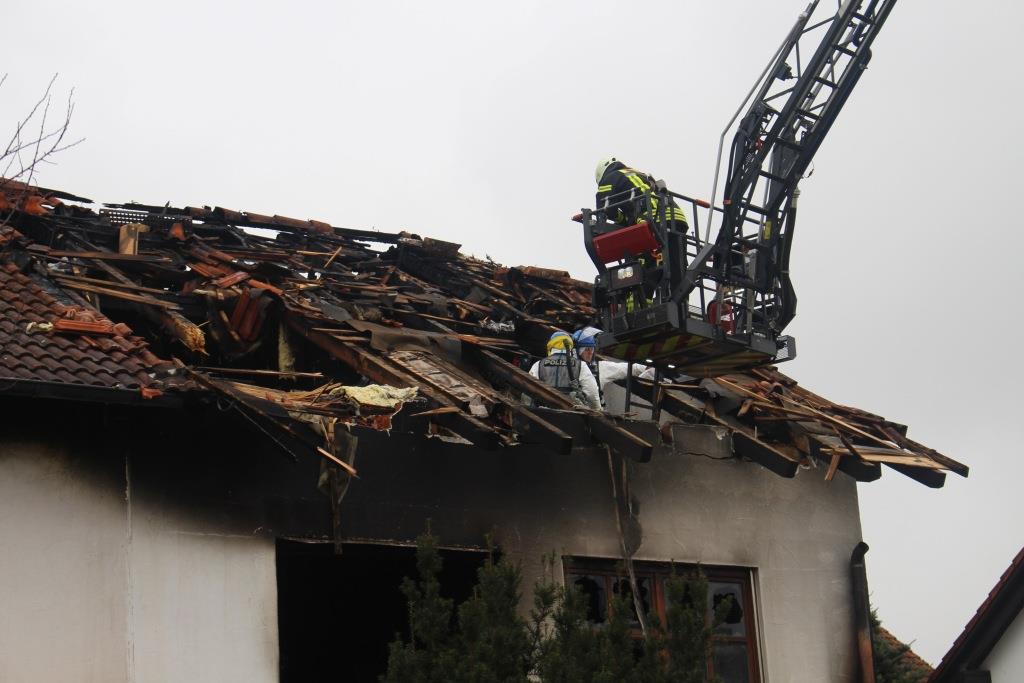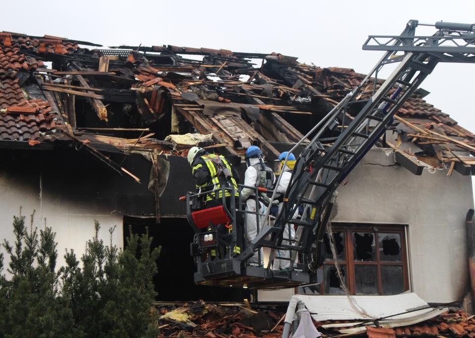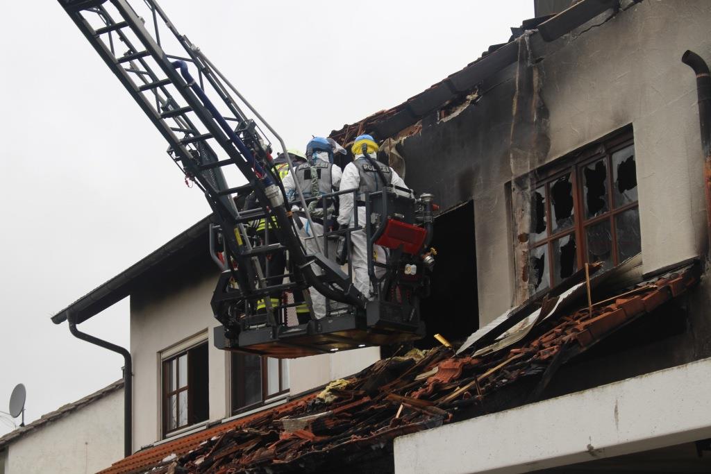 In das Obergeschoss können die Brandermittler nur über die Drehleiter der Feuerwehr gelangen, da die Treppe im Haus zerstört wurde. – Foto: Michael Kraus