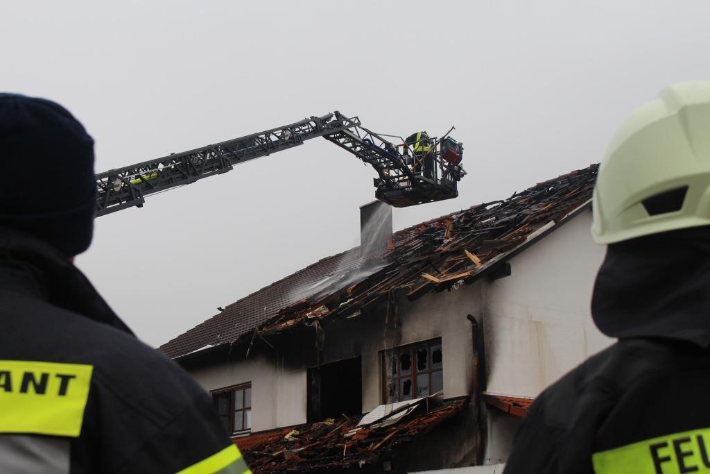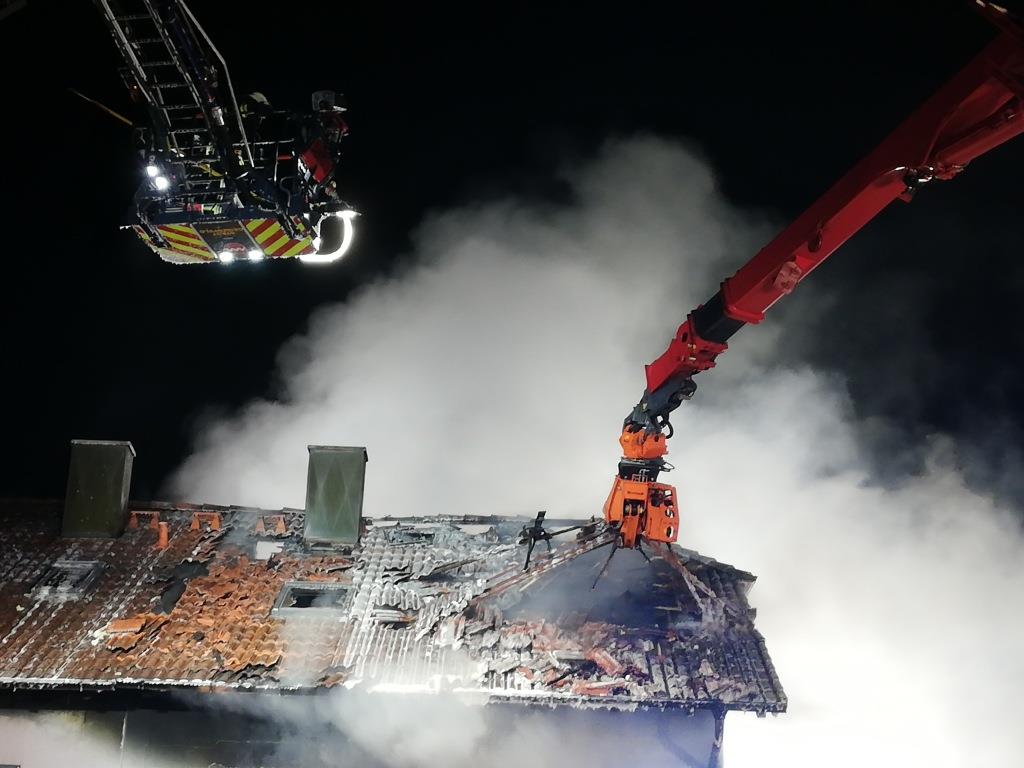 Ein riesiger Kran deckte in der Unfallnacht spät in der Nacht das Dach ab. Dies ermöglichte der Feuerwehr einen besseren Zugang zu den noch im Haus lodernden Brandherden. – Foto: Ellen Kellerer