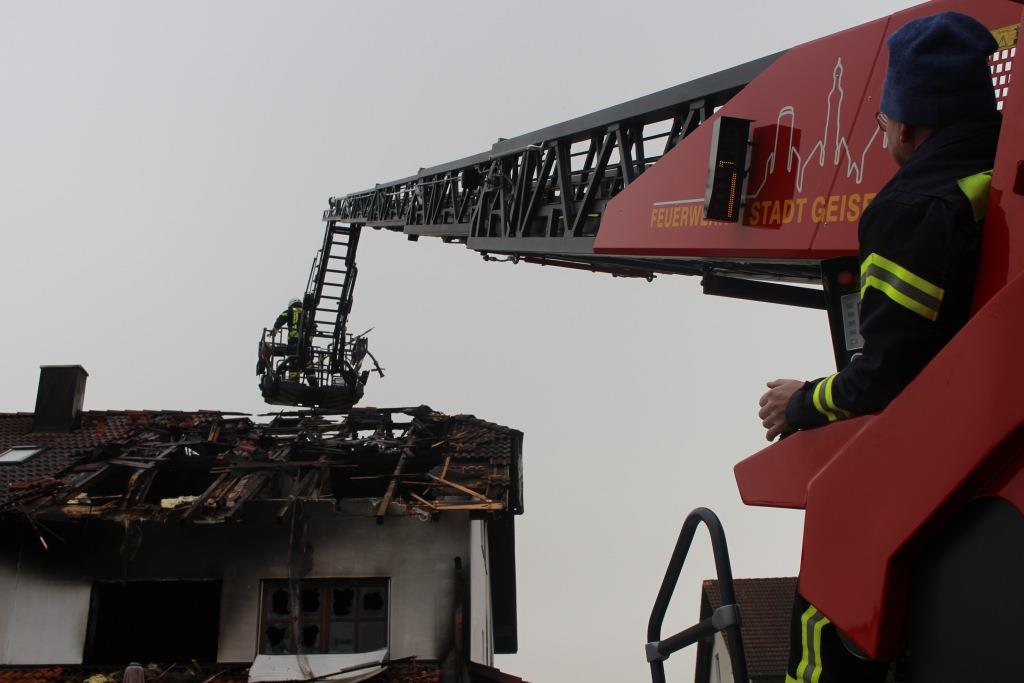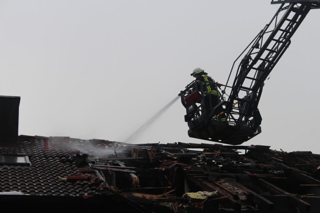 Von der Drehleiter aus sorgt die Feuerwehr Geisenfeld dafür, dass die Dachkonstruktion nicht erneut in Brand gerät. – Foto: Michael Kraus