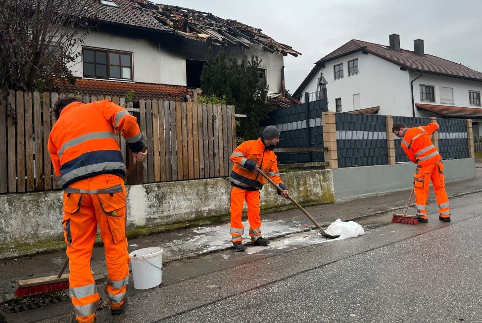 Am Dienstagmorgen sind die Mitarbeiter des städtischen Bauhofs im Einsatz: Sie säubern unter anderem die Straße von den Scherben, die durch die Wucht der Explosion herumgeschleudert wurden. – Foto: Ellen Kellerer
