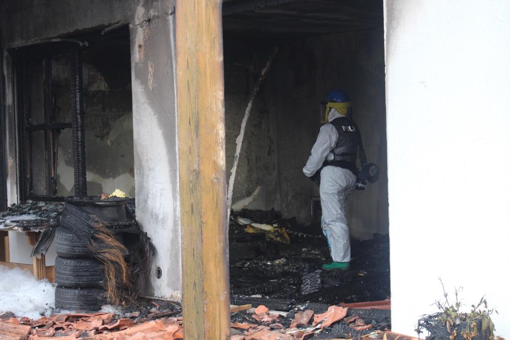 Gegen Mittag schlossen die Brandermittler ihre erste Inspektion der Brandruine ab. Die Ermittlungen werden noch bis mindestens Dienstag andauern. – Foto: Michael Kraus