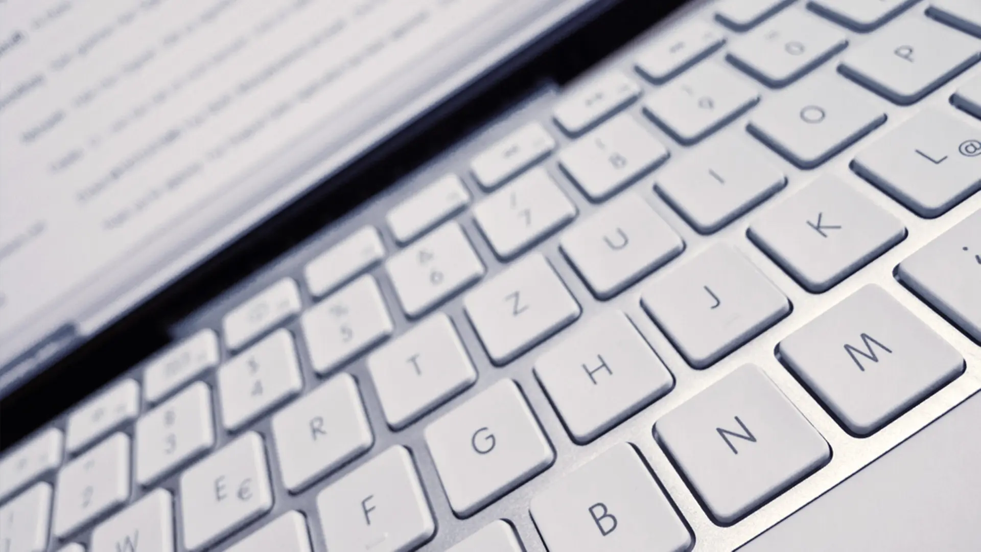 Eine schwarze, runde Schreibtischlampe beleuchtet eine Tastatur mit Händen.