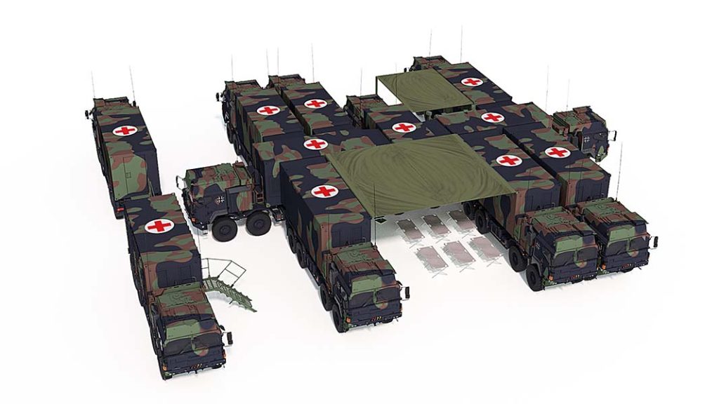 Nach Angaben von Rheinmetall besteht jede dieser medizinischen Einrichtungen aus insgesamt elf Fahrzeugen mit zugehörigen Multifunktionscontainern. Die Container verbleiben während des laufenden Betriebs auf den Fahrzeugen. Dabei handelt es sich um militärische HX-Lkw von Rheinmetall MAN Military Vehicles. Dadurch sind die Sanitätseinrichtungen hochmobil und können im Rahmen der der Bedrohungslage angepassten Landes- und Bündnisverteidigung eingesetzt werden. Dadurch können Schwerverletzte im Frontbereich versorgt werden. Hinsichtlich Mobilität und Schutz gebe es in der NATO derzeit kein vergleichbares System, sagt Rheinmetall.