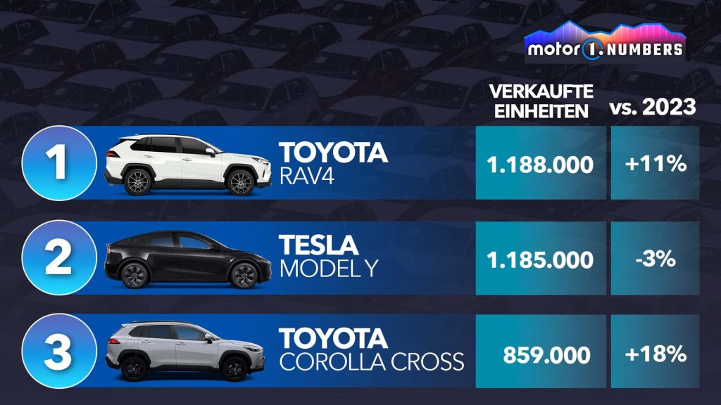 Nach der Dominanz in der Rangliste im letzten Jahr bietet das Tesla -Modell Y den ersten Platz für den Toyota RAV4 (auch als Wildland in China verkauft). Dies geschah mit einem sehr engen Vorsprung: rund 3.000 weitere Einheiten für den Toyota, das das Jahr mit rund 1.187.000 verkauften Autos beendete (+11 % gegenüber 2023).