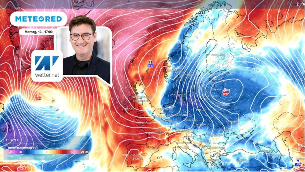 Ab nächster Woche strömen aus Nordosten kalte Luftmassen nach Deutschland. Gleichzeitig schießen sehr warme Luftmassen bis nach Island auf der anderen Seite. © METEORED/www.daswetter.com