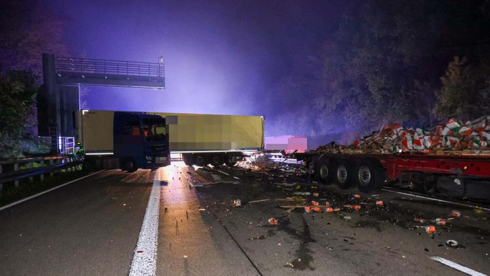 Durch den Aufprall riss die Plane des herannahenden Anhängers und die Ladung mit Lebensmitteln, Champagner und Spirituosen verteilte sich über beide Fahrspuren. Auch hier werden die Aufräumarbeiten voraussichtlich bis zum Nachmittag dauern.