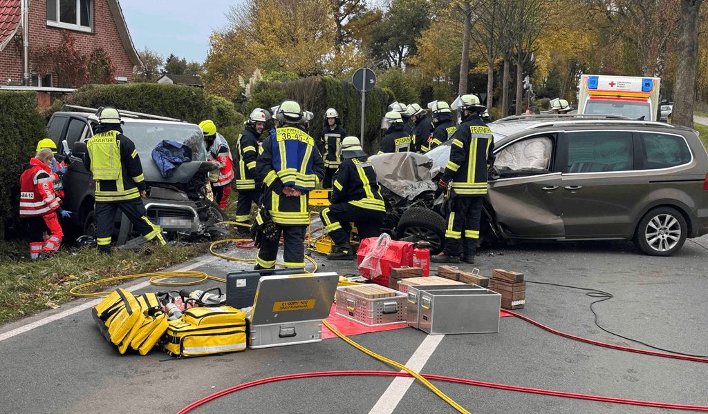 Unfall auf einer Landstraße in Horneburg im Kreis Stade: Samstagnachmittag Sind Zwei Kleinbusse prallten frontal ineinander. Vier Menschen wurden verletzt, einer von ihnen wurde mit dem Hubschrauber ins Krankenhaus geflogen.