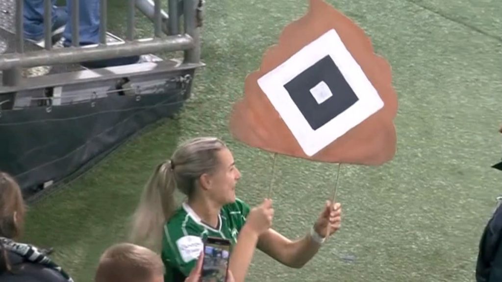 Desic erhält von einem kleinen Fan ein Pappschild in Form eines Kothaufens. Auf dem ungewöhnlichen Papier prangt das HSV-Logo. Die Werder-Frau jubelt mit dem Plakat Richtung Tribüne.