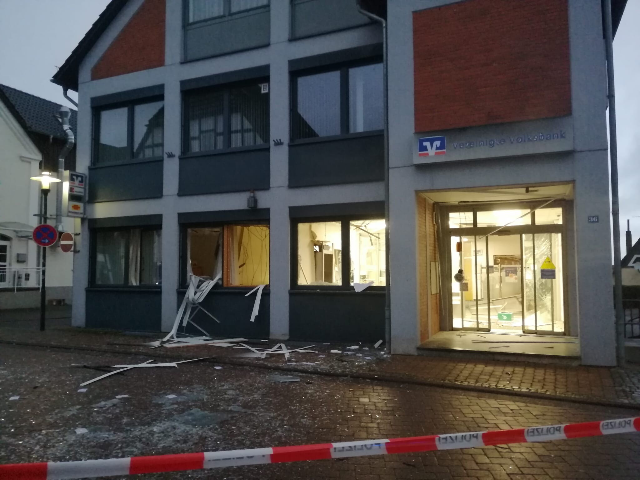 Gegen 3:45 Uhr hörten mehrere Anwohner die Explosion und riefen die Polizei. Mehrere Unbekannte sprengten den Geldautomaten der Vereinigten Volksbank in der Nieheimer Marktstraße – Fenster und Türen gingen kaputt. Die Straße ist voller Glasscherben.