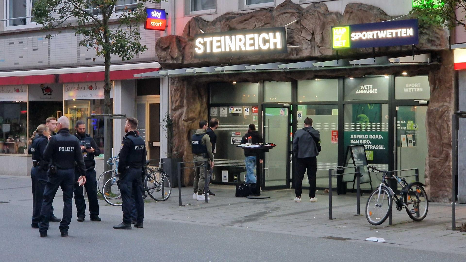 Die Polizei sperrte den Tatort auf dem Marktplatz nahe einer zentralen Bushaltestelle und unweit einer Fußgängerzone mit Absperrband ab. Vor dem Sportwettbüro parkten mehrere Streifenwagen, die Spurensicherung war vor Ort.