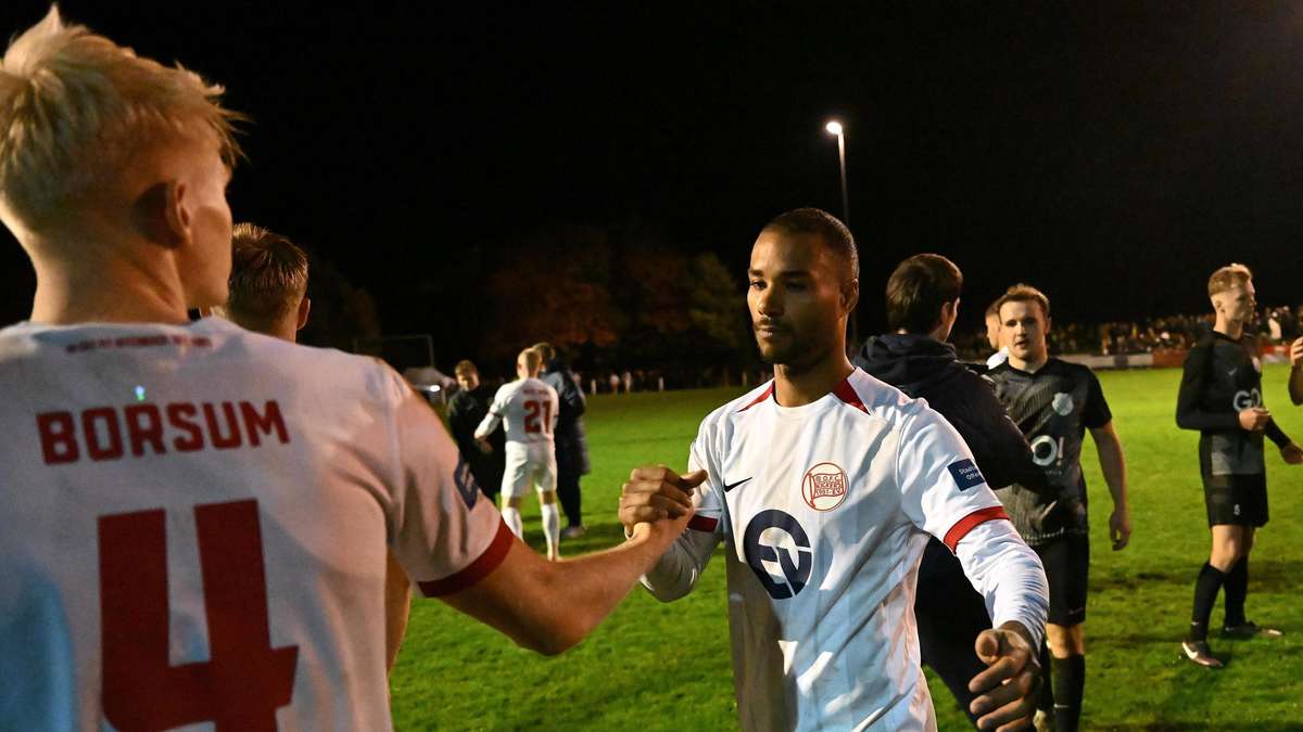 Ernsthafte Miene trotz Fortschritt: OFC-Verteidiger Jayson Breitenbach (Mitte) küsst seinen Kollegen Jona Borsum nach dem Pokal-Achtelfinale in Leusel. Breitenbach sollte geschont werden, wurde aber eingewechselt und traf im Elfmeterschießen ungefährdet. © Jan Hübner/Jan Hübner
