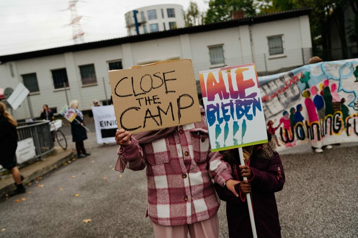 An diesem Sonntagnachmittag hören ihm rund hundert Menschen zu. Einige kamen aus der Hamburger Innenstadt, andere wie Agha aus der Unterkunft. Die Bewohner organisierten die Demonstration unter dem Motto „Gemeinsam Widerstand leisten: Lager abschaffen“ gemeinsam mit antirassistischen Initiativen selbst. Vor einer Woche warf ein leitender Mitarbeiter des Sicherheitsunternehmens Elb Security über Nacht fünfzehn Bewohner raus und verbot ihnen den Zutritt zum Gebäude. Die Männer verbrachten die Nacht auf dem Bürgersteig.