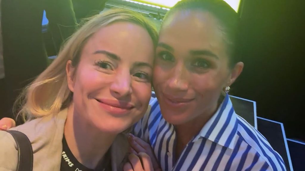 Das Paar trat am Freitag beim Festival in den „Spring Studios“ deutlich lässiger auf als am Donnerstagabend. Meghan trug ein blau-weiß gestreiftes Hemd und eine dunkelblaue Marlene-Hose, während Harry sich erneut für einen klassischen schwarzen Anzug entschied – dieses Mal jedoch ohne Krawatte.