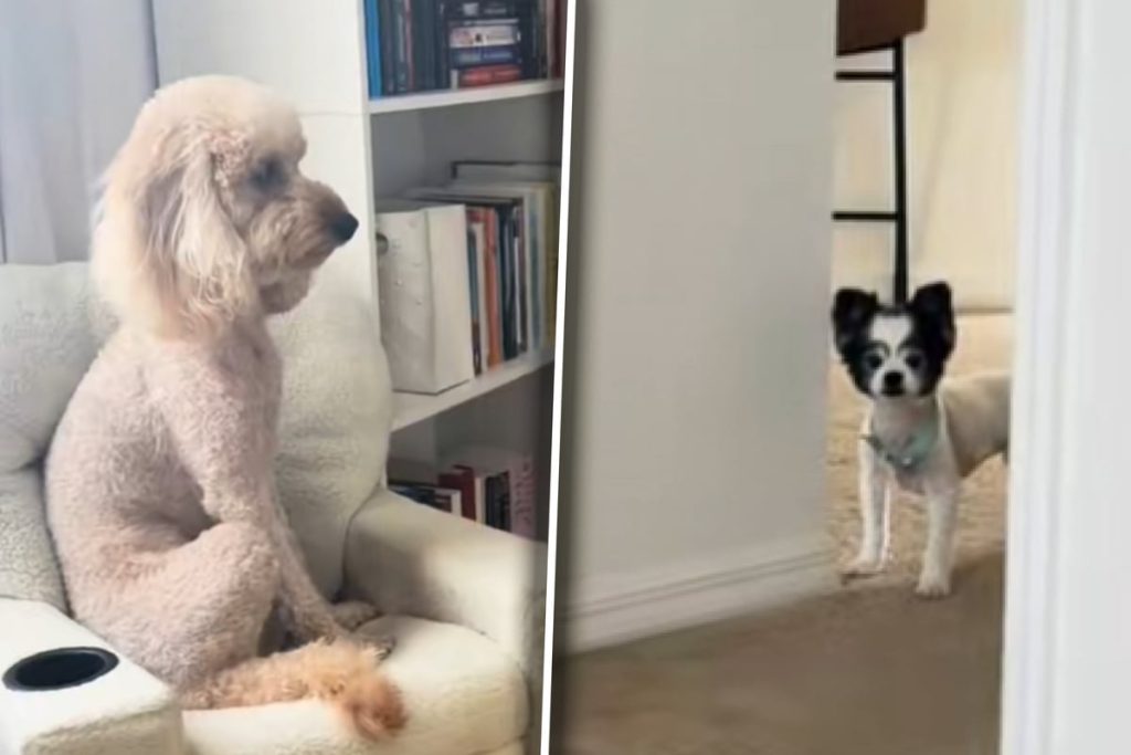 Beleidigt? Goldendoodle Lady Piper (links) ist in jedem Fall in ihrem Sessel sehr gepflegt, als ihre Erz-Rivalen-Trixie in ihren heiligen vier Wänden vier Wände öffnete. © Bildanordnung: Tikok/Screenshots/LoganMakenzee
