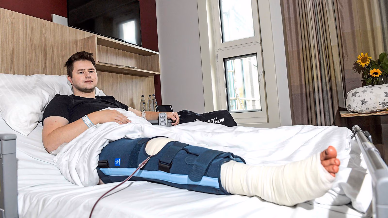 Er hatte Glück im Unglück. Kreuz- und Seitenbänder sowie der Meniskus im rechten Knie sind gerissen. Ansonsten hat er aber nur Schürfwunden. Die UKB-Spezialisten behandelten das Knie in einer zweistündigen Operation.