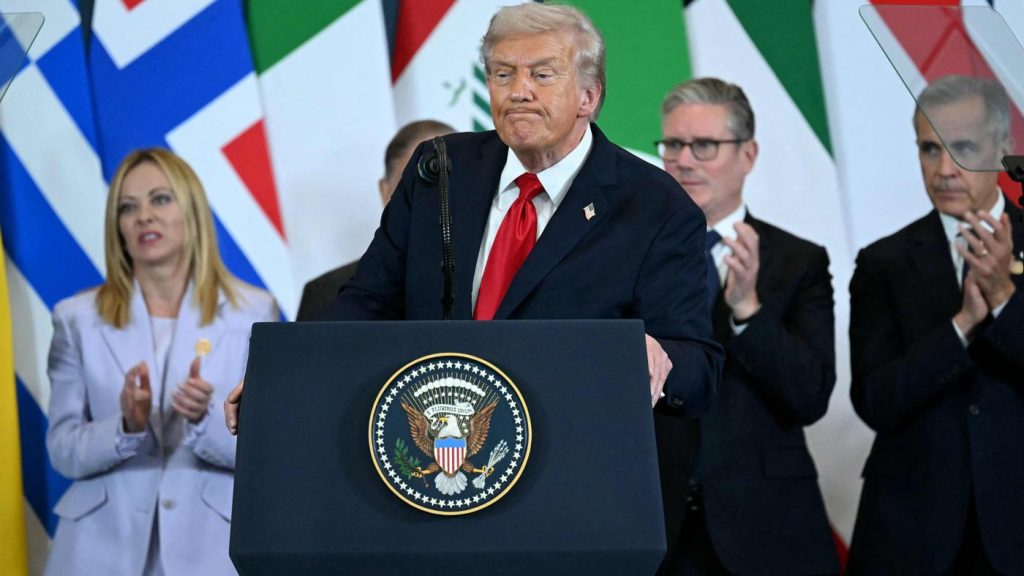Trump verteilte später während seiner Rede ein weiteres Exemplar Ein Seitenhieb auf MacronDenn er stand nicht wie Italiens Präsident Meloni oder Bundeskanzler Friedrich Merz hinter Trump auf der Bühne. „Ich kann nicht glauben, dass du dich heute bedeckt hältst“, sagte er mit einem leicht ironischen Ton.