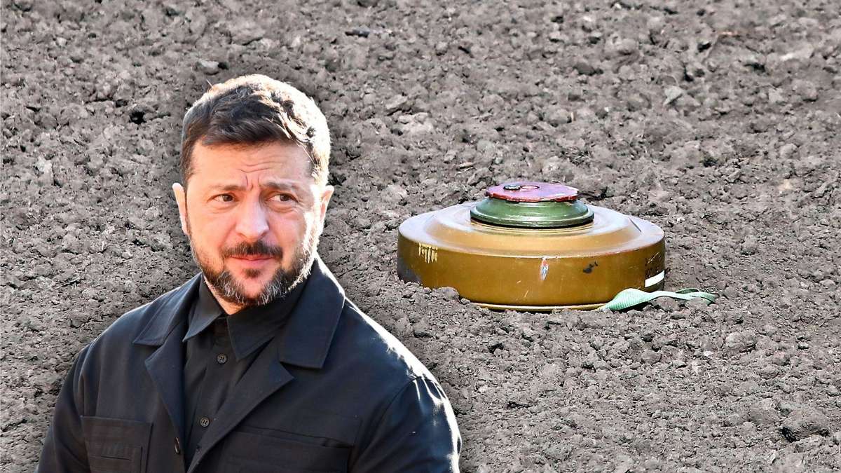 Wolodymyr Selenskyj vor einer Mine auf einer Teststelle im Ukrainekrieg.