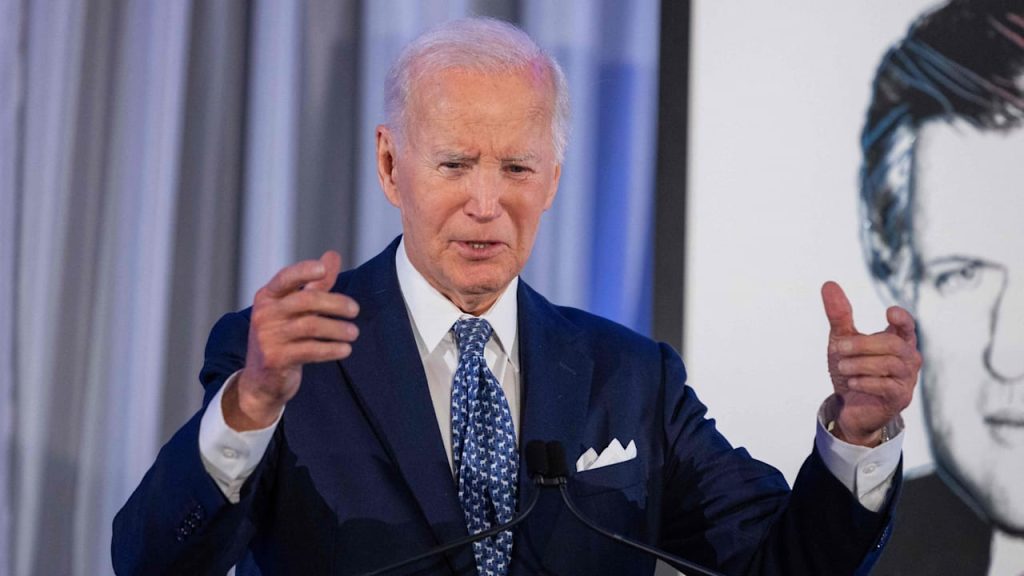 Der ehemalige Präsident Joe Biden hört einem Redner zu, bevor er bei der Feier zum 10-jährigen Jubiläum des Edward M. Kennedy Institute in Boston einen Preis für sein Lebenswerk entgegennimmt