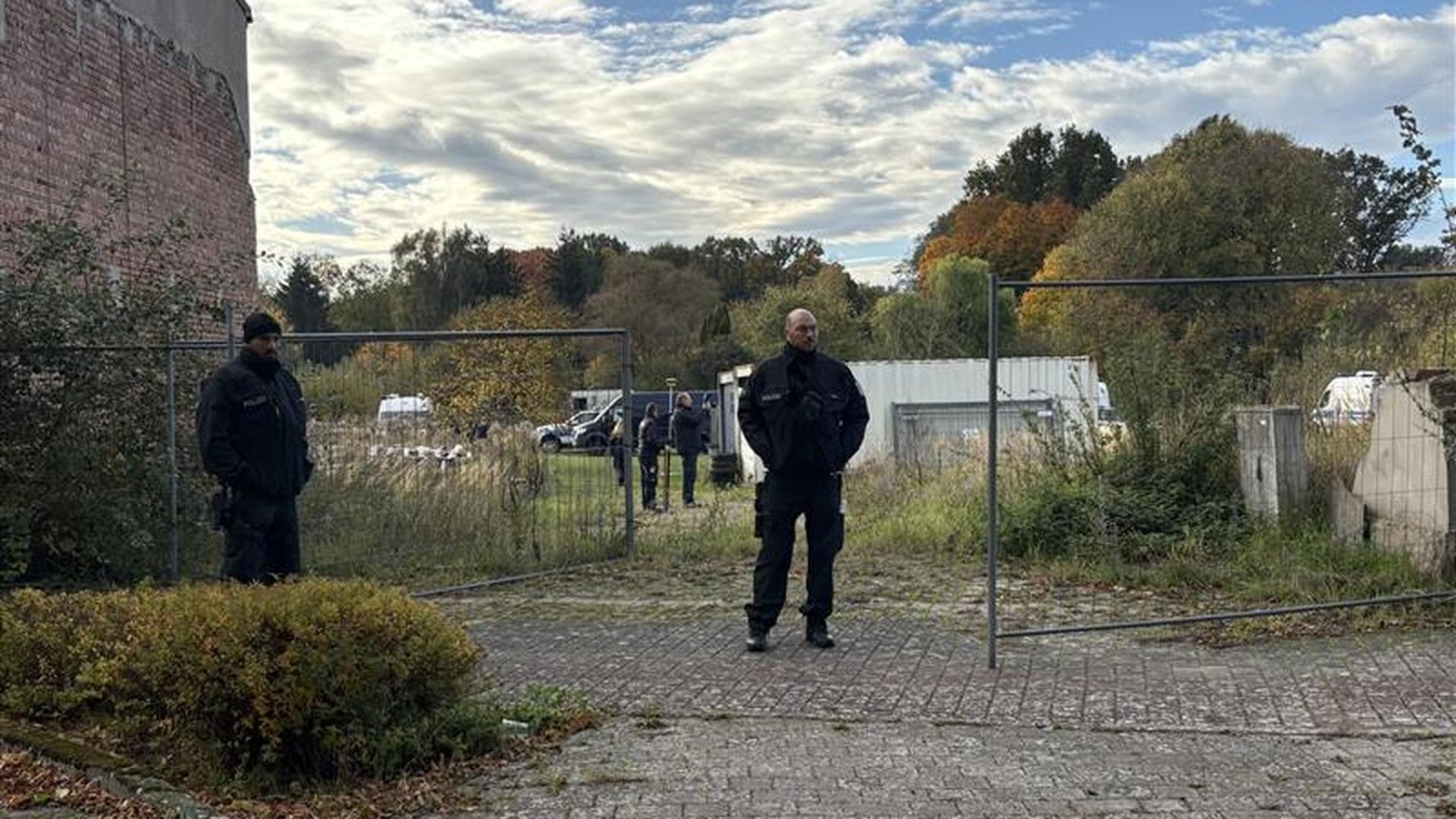 Die Polizei hat das Gebiet abgesperrt. Im Einsatz sind neben einem Bagger auch eine Drohne und Messgeräte, ein sogenanntes Bodenradar. Beamte machen Fotos. In der Nähe stehen mehrere leere Häuser.