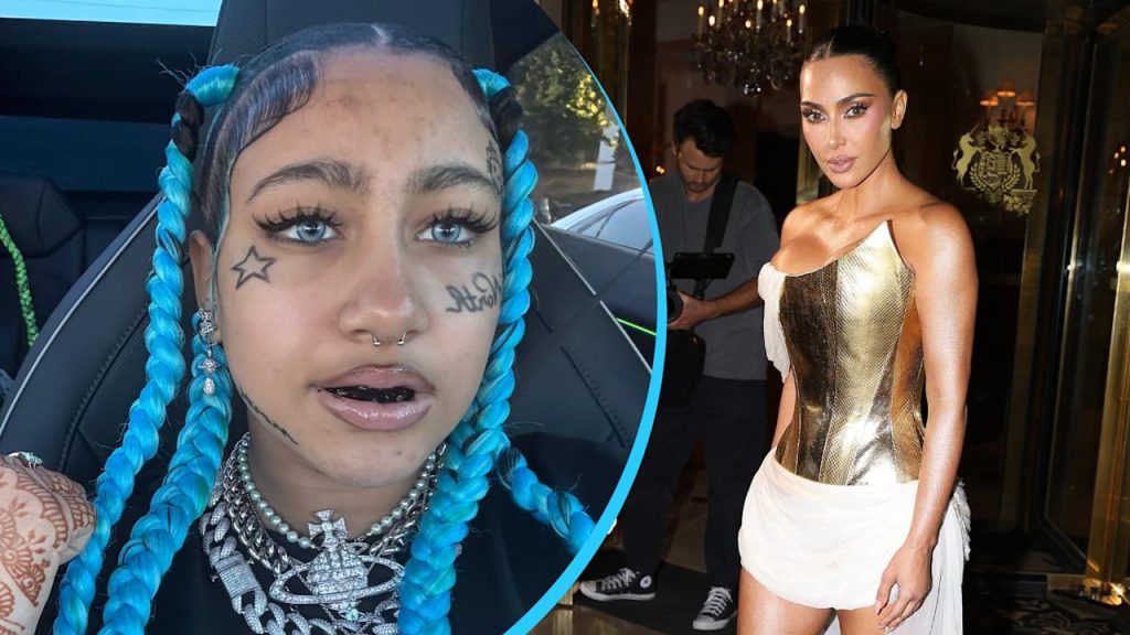 In mehrere TikTok-Videos Die 12-Jährige filmt sich dabei, wie sie sich für einen Mädelsausflug mit ein paar Freundinnen schick macht. Mit blauem Kunsthaar, Grillz (Zahnschmuck), blauen Kontaktlinsen, Nasenring und aufgemalten Tattoos posiert North im Privatjet, im Auto oder sogar backstage bei einem Konzert. Unter einem Auge leuchtet ein Stern, ihr Name steht in Schreibschrift auf ihrer Wange und North hat auch ihr Kinn und ihre Schläfe geschmückt.
