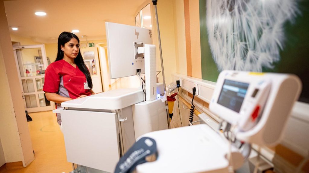 Eine Krankenschwester arbeitet am Computer im Vivantes Auguste-Viktoria-Klinikum in Berlin.