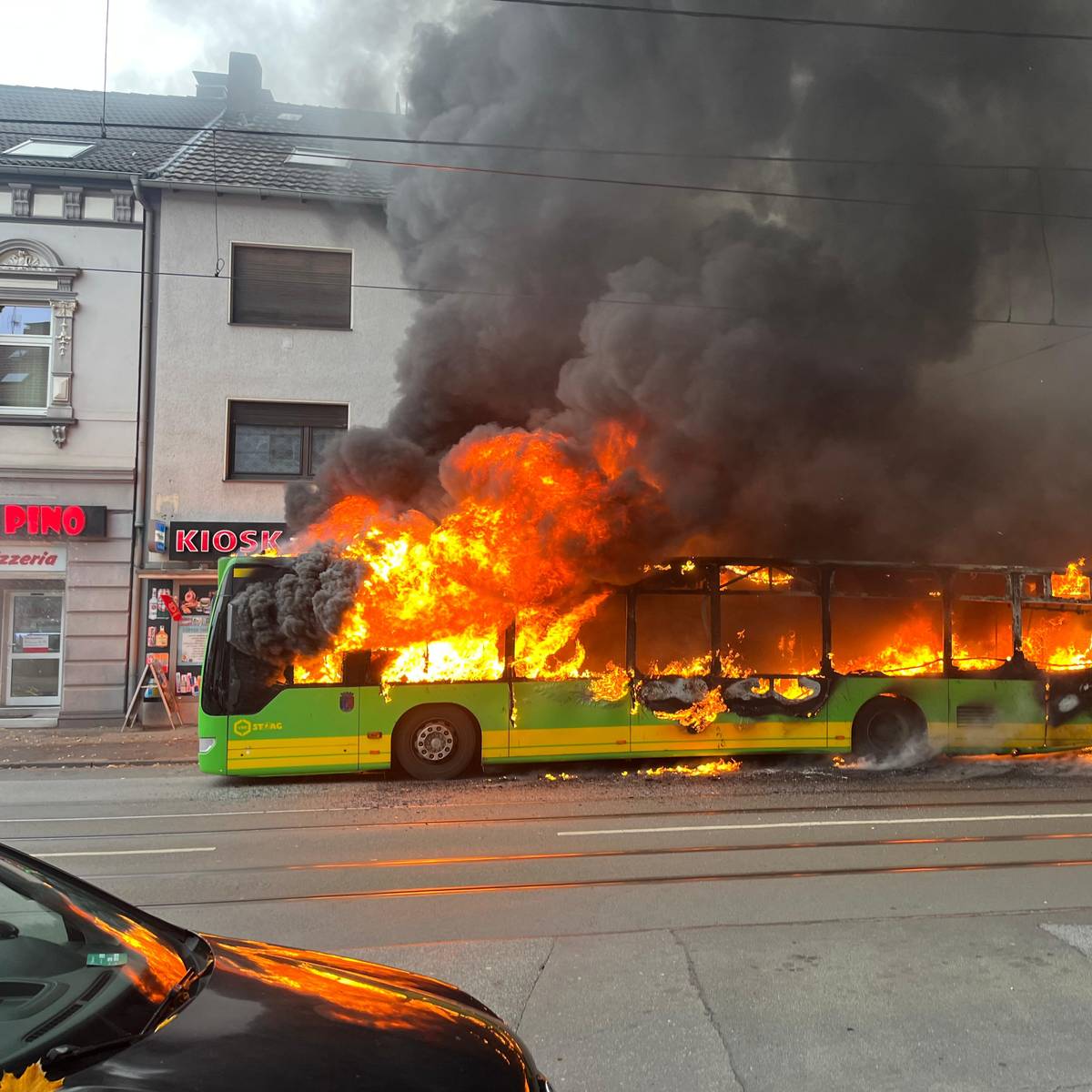 Am Montag (3. November) ist in Essen ein Bus aus Oberhausen ausgebrannt. Eine Straße wurde deshalb gesperrt. Der Busfahrer wurde mit leichten Verletzungen ins Krankenhaus gebracht.
