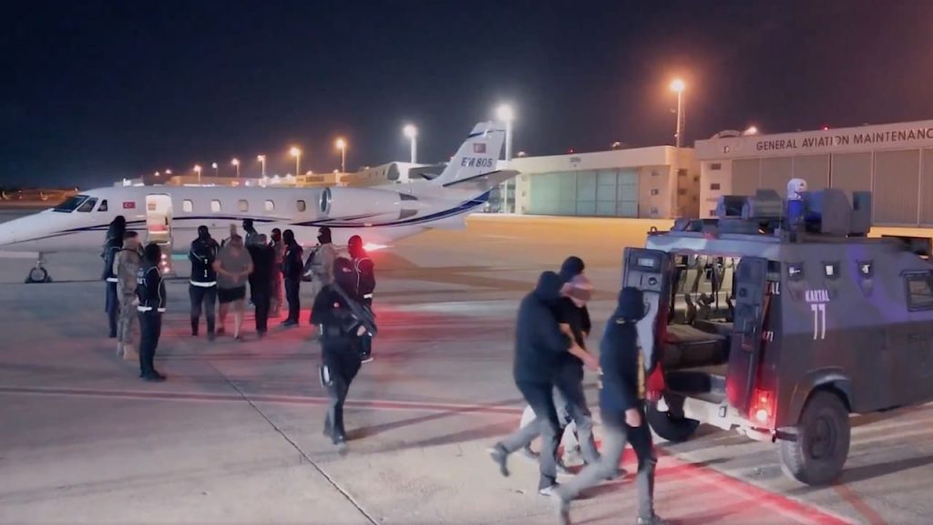 Der türkische Innenminister Ali Yerlikaya (57) gab auf X bekannt, dass der international gesuchte Verdächtige am Samstagmorgen in einem Privatjet an die Türkei ausgeliefert worden sei. Der Innenminister teilte Bilder der Aktion. „Don Vito“ und sein mutmaßlicher Komplize Hasan L. sind mit verbundenen Augen im Jet zu sehen, umgeben von maskierten Menschen Polizisten.