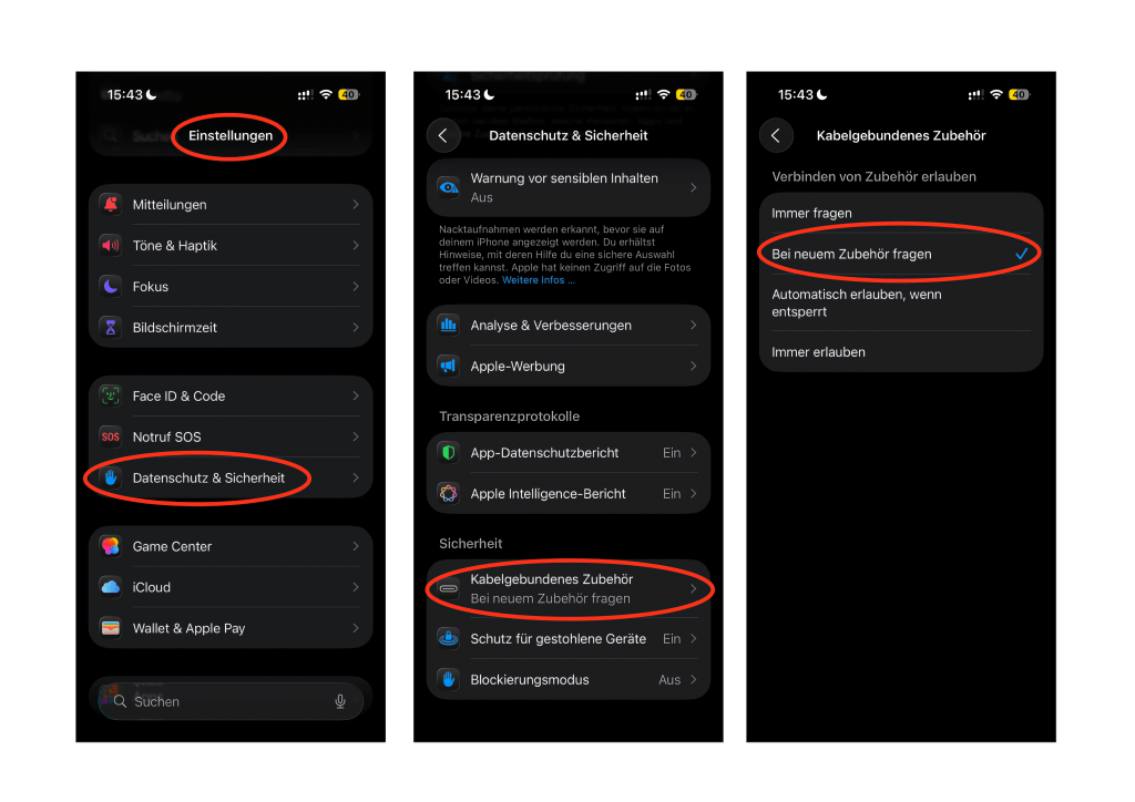 Öffnen Sie ab iOS 26 zunächst die Einstellungen auf dem iPhone. Dort gehen Sie auf „Datenschutz und Sicherheit“ und scrollen ganz nach unten, bis Sie unter der Überschrift „Sicherheit“ den Eintrag finden: „Kabelgebundenes Zubehör“. Hier wählen Sie die neue Einstellung „Nach neuem Zubehör fragen“ oder, wenn Sie auf Nummer sicher gehen wollen, sogar: „Immer nachfragen“.