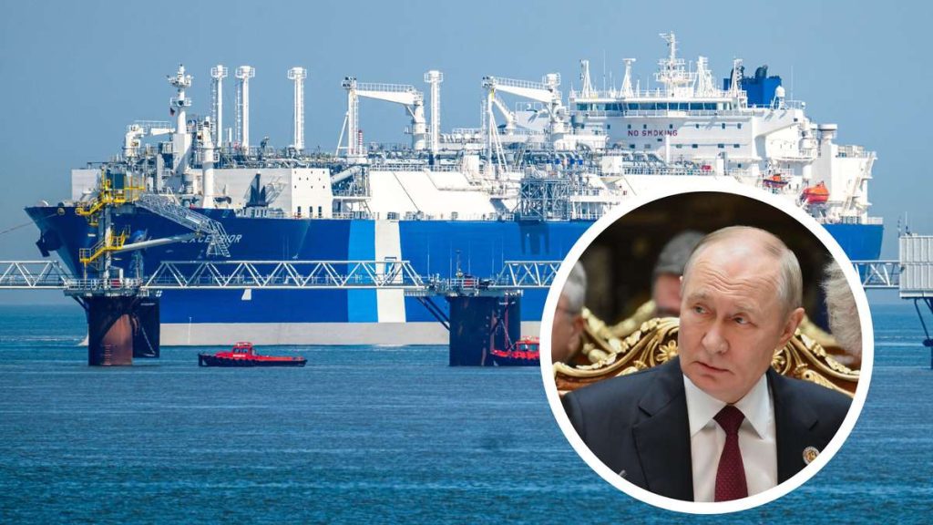 Montage: Das Spezialschiff „Excelsior“ zur Umwandlung von flüssigem Erdgas in einen gasförmigen Zustand läuft im Hafen ein. Daneben hängt ein Foto des russischen Präsidenten Wladimir Putin.
