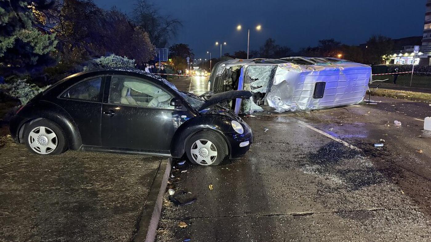 Bilder vom Unfallort zeigen den völlig ramponierten Transporter auf der Seite liegend. Fahrzeugteile liegen verstreut auf der Straße, die gesamte Front eines beteiligten Volkswagens ist zerquetscht und mit Dellen übersät.