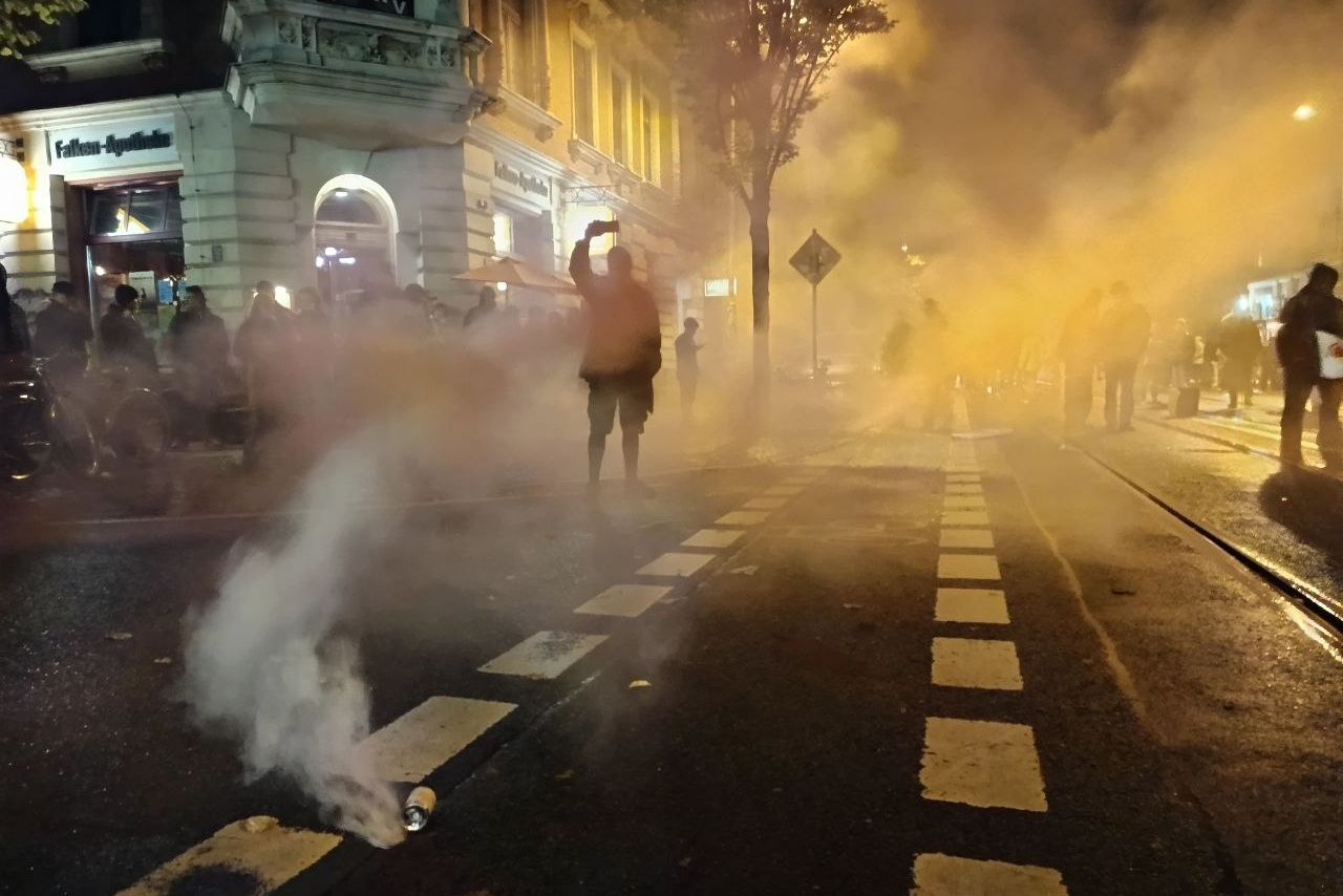 Die Demonstranten werfen Absperrungen und Mülltonnen auf die Straße – die ersten kleinen Barrikaden. Die ersten Feuer lodern. Die Polizei trifft am Tatort ein.