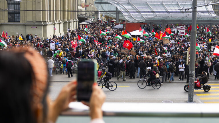 Am Samstagnachmittag versammelten sich mehrere tausend Demonstranten auf dem Berner Bahnhofplatz zu einer nicht genehmigten pro-palästinensischen Kundgebung. Die Demonstration begann gegen 15 Uhr und führte schnell zu erheblichen Störungen des Stadtverkehrs. Laut Berner Zeitung Um 15.30 Uhr war der Platz bereits voll. Palästinafahnen dominierten das Bild, aber auch Fahnen kommunistischer Bewegungen, linker Gruppen und des Klimastreiks wurden geschwenkt.