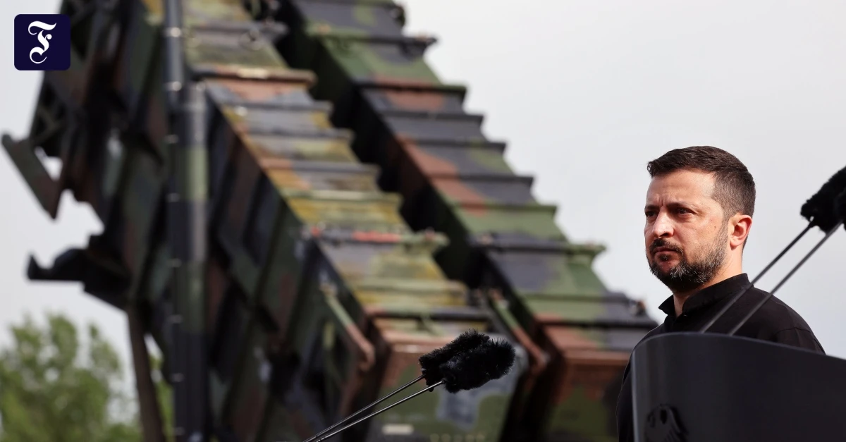 Wolodymyr Selenskyj vor einem Patriot-System auf einem Truppenübungsplatz in Mecklenburg-Vorpommern im Jahr 2024dpa