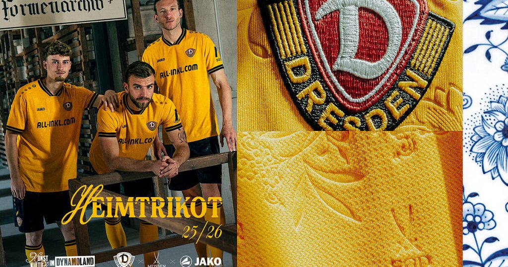 In dieser speziellen Dreieck -Zusammenarbeit zwischen Dynamo Dresden, der Meissen -Porzellanfabrik und Jako, wurde ein außergewöhnliches Trikot für die neue Saison der zweiten Division geschaffen.