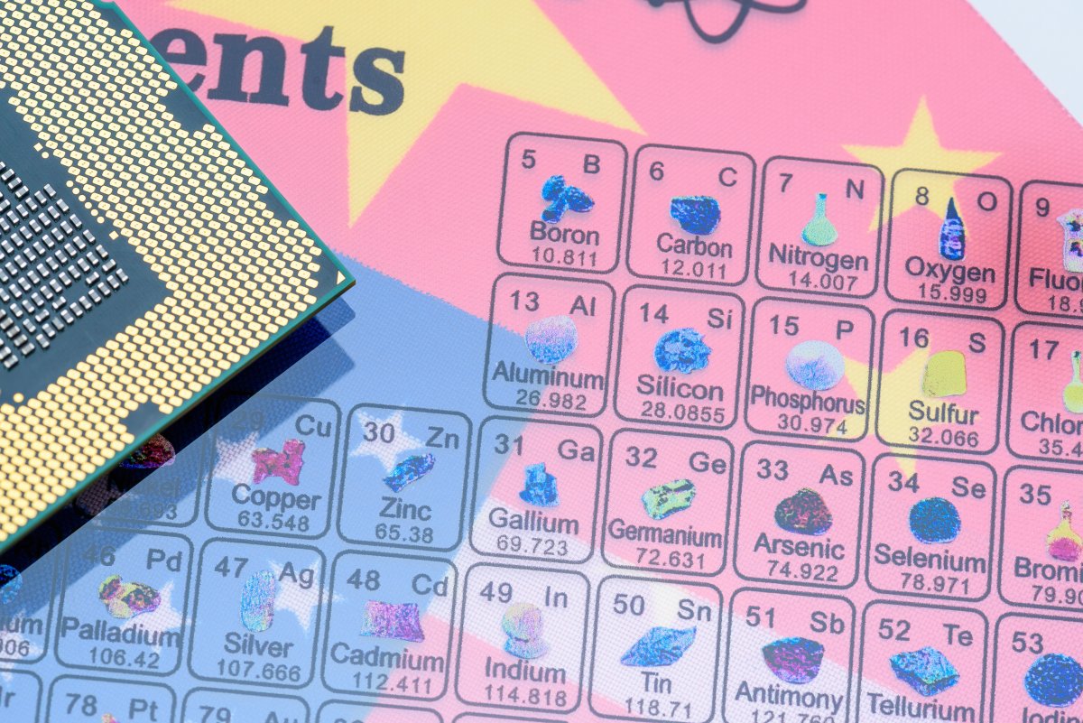 Ein CPU-Chip, ein Periodensystem über der chinesischen und US-amerikanischen Flagge – als Symbol für den Kampf um seltene Erden.