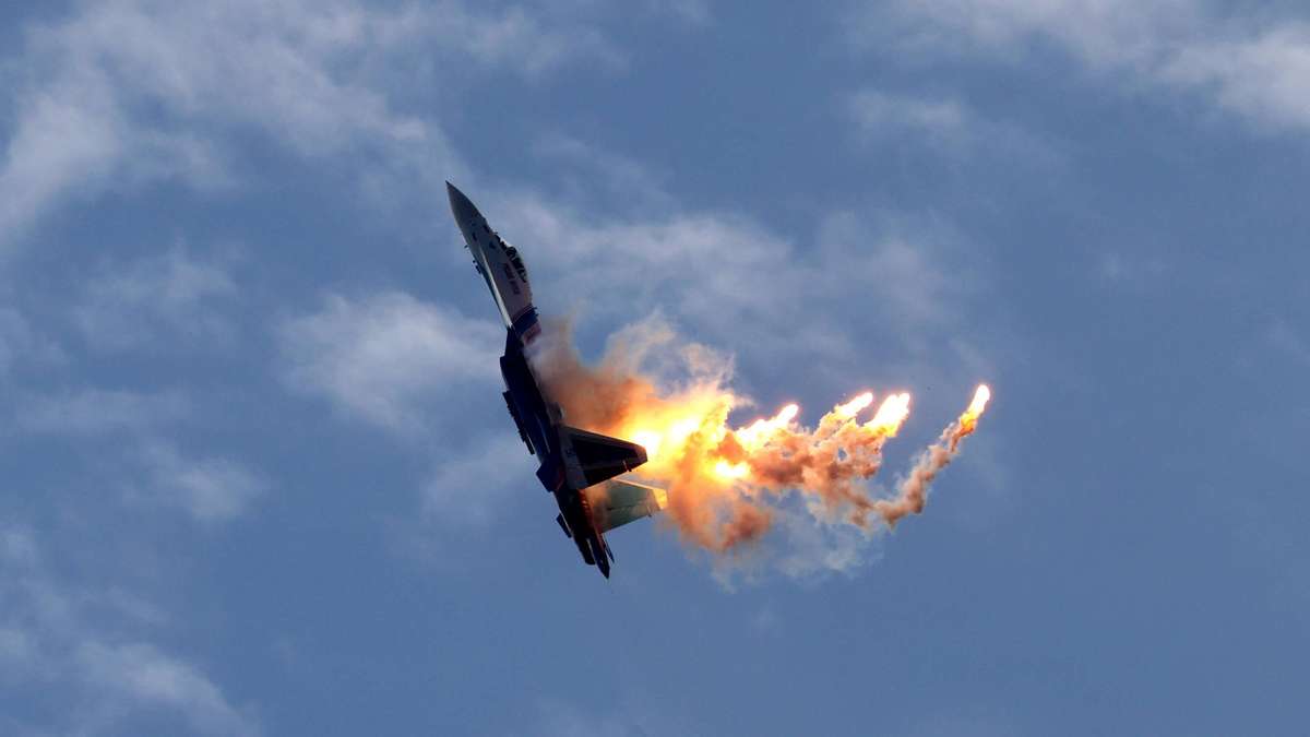 Die russische Luftverteidigung trifft versehentlich eines ihrer eigenen Kampfflugzeuge. Der Pilot katapultiert sich aus seinem Flugzeug, nachdem er von der Rakete getroffen wurde.