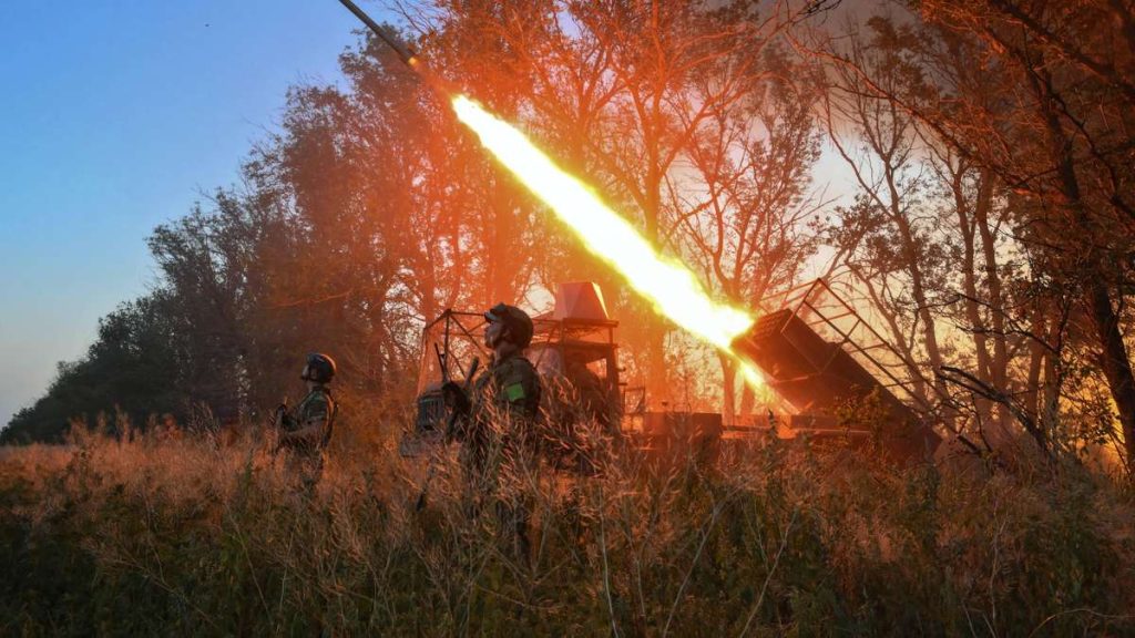 Russische Soldaten feuern einen Mehrfachraketenwerfer vom Typ 9K55 der Klasse 1 auf ukrainische Stellungen im Abschnitt Krasnoarmeisk bei Pokrowsk (Archivfoto vom 10. Juli 2025).