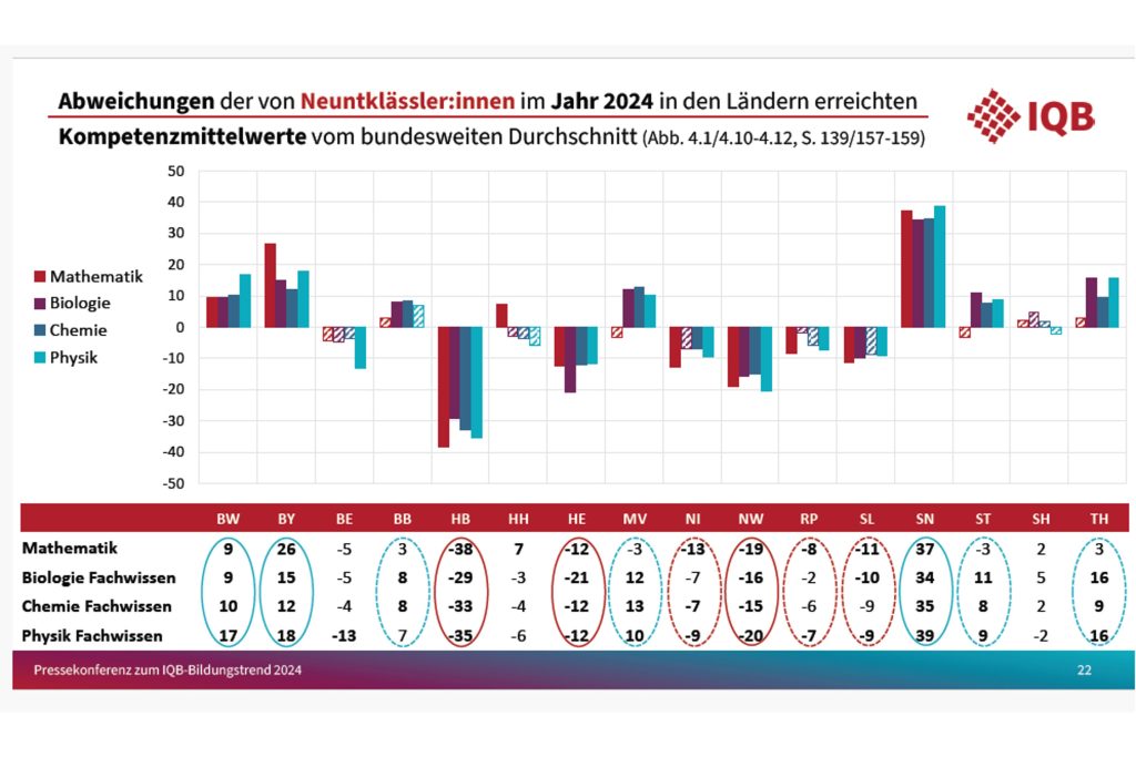„Insgesamt sind die Leistungen jedoch in allen Bundesländern gesunken. Eine Entwicklung, die zeigt, dass Pandemie, Lehrermangel und gesellschaftliche Verwerfungen ihre Spuren hinterlassen haben.“