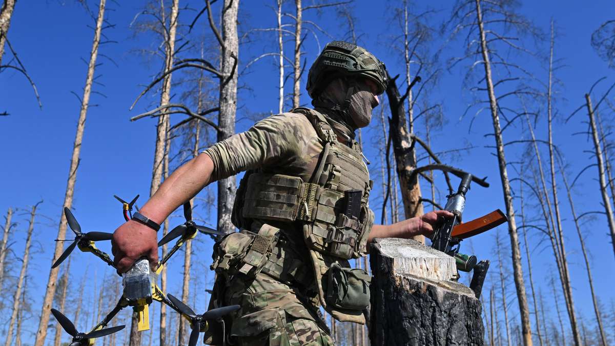 Ein russischer Soldat bereitet sich vor dem blauen Himmel darauf vor, eine FPV-Drohne zwischen kahlen Bäumen zu starten.
