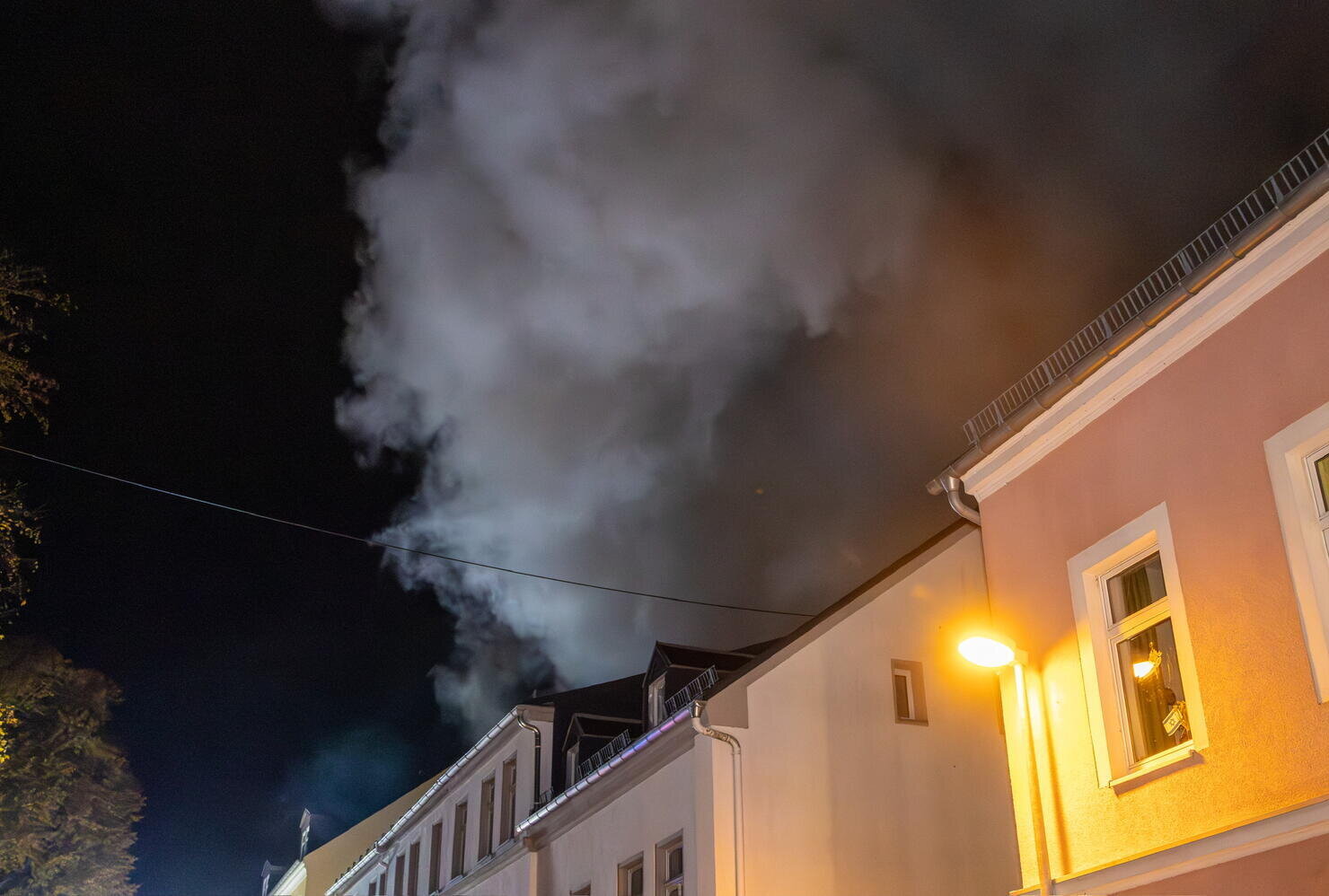 Über der Bockauer Straße steigen schwarze Rauchwolken auf. Durch den Brand entstand im gesamten Gebäude starke Rauchentwicklung. Foto: Niko Mutschmann