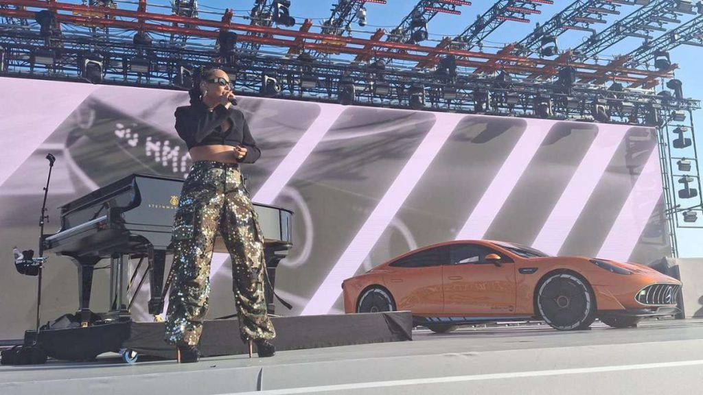 Gegen 19 Uhr stieg das neue Modell auf einer speziell gebauten Stufe des Parkhauss aus dem Boden. Die Sängerin der American Soul und der R’n’B hatten gestern ein AMG-Projekt eins in Affalterbach abgeholt und haben ihren Aufenthalt kurz erweitert. Auf dem Parkdeck tanzten die eingeladenen Gäste zu Hits wie Empire State of Mind.