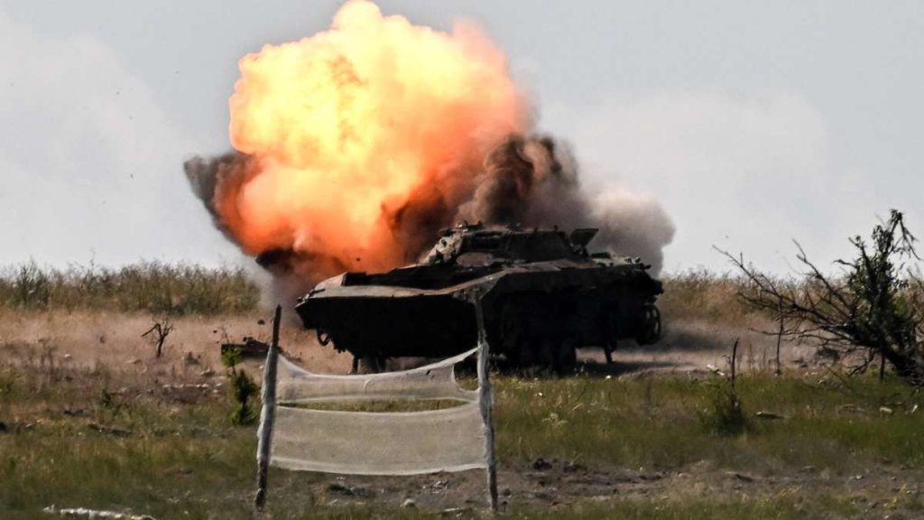 Während des Drohnentrainings der russischen Armee für den Krieg in der Ukraine ist ein explodierender Panzer zu sehen.