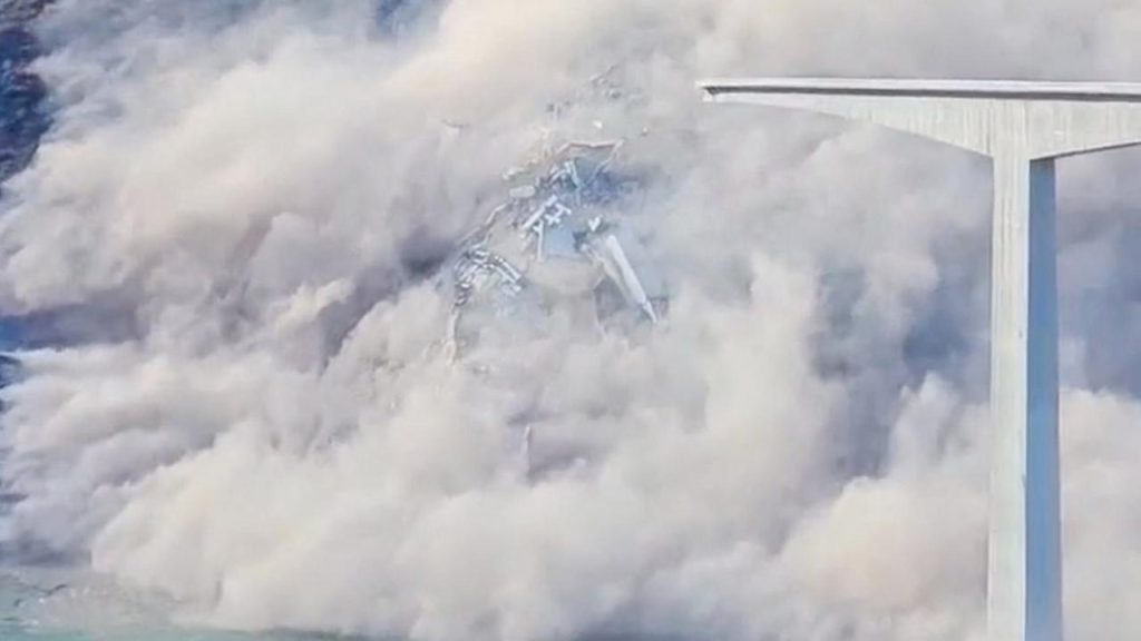 Chinas soziale Medien und das Staatsfernsehen zeigten Aufnahmen von nachgebenden Pfeilern in Küstennähe und dem Abriss eines Teils der Brücke. Dann stieg eine dicke Staubwolke auf.
